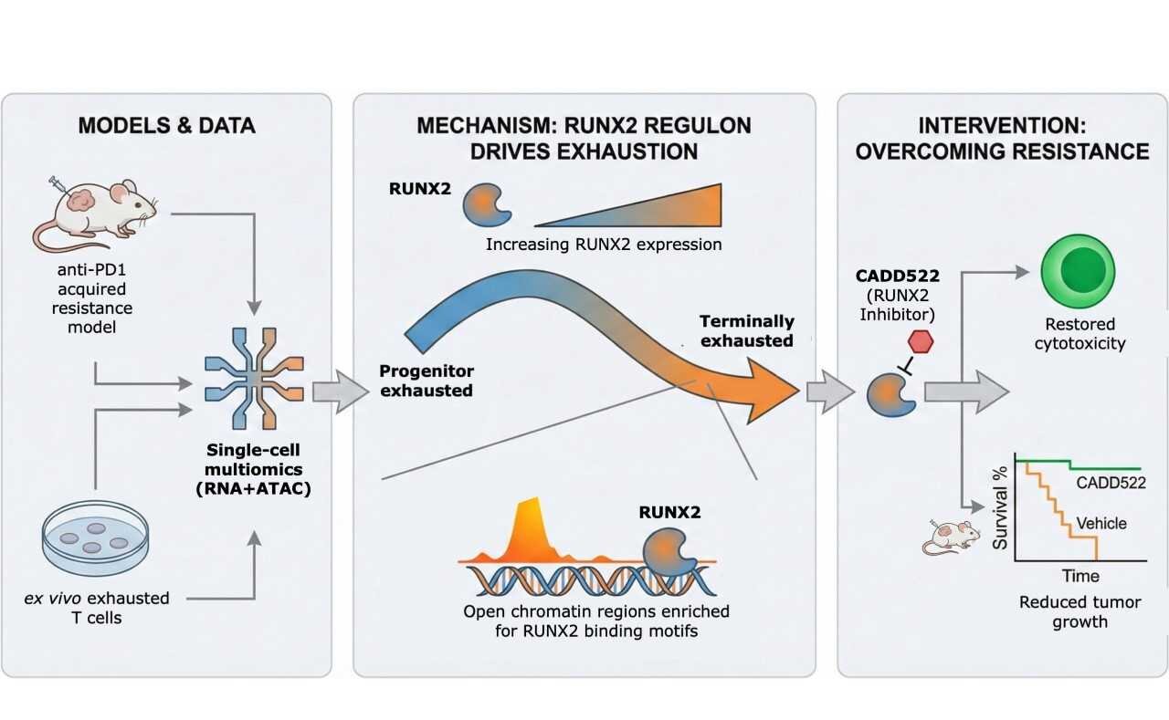 RUNX2 inhibition restored the cytotoxic function of exhausted T cells and significantly suppressed tumor growth, indicating that targeting this pathway may reinvigorate antitumor immunity even after immunotherapy failure.