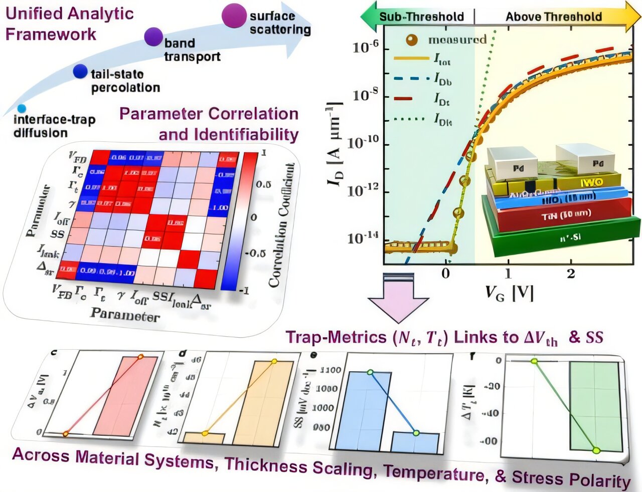 That uncertainty is the main problem addressed in the new study from National Taiwan University. Rather than focusing only on reporting device performance, the researchers built a unified analytical framework that explains how ultrathin indium-oxide-based transistors operate across the full switching range. The model connects several effects that are usually studied separately: ordinary band transport, current through electronic trap states, defect-assisted current at the dielectric interface, and mobility loss caused by surface roughness as the channel becomes atomically thin.