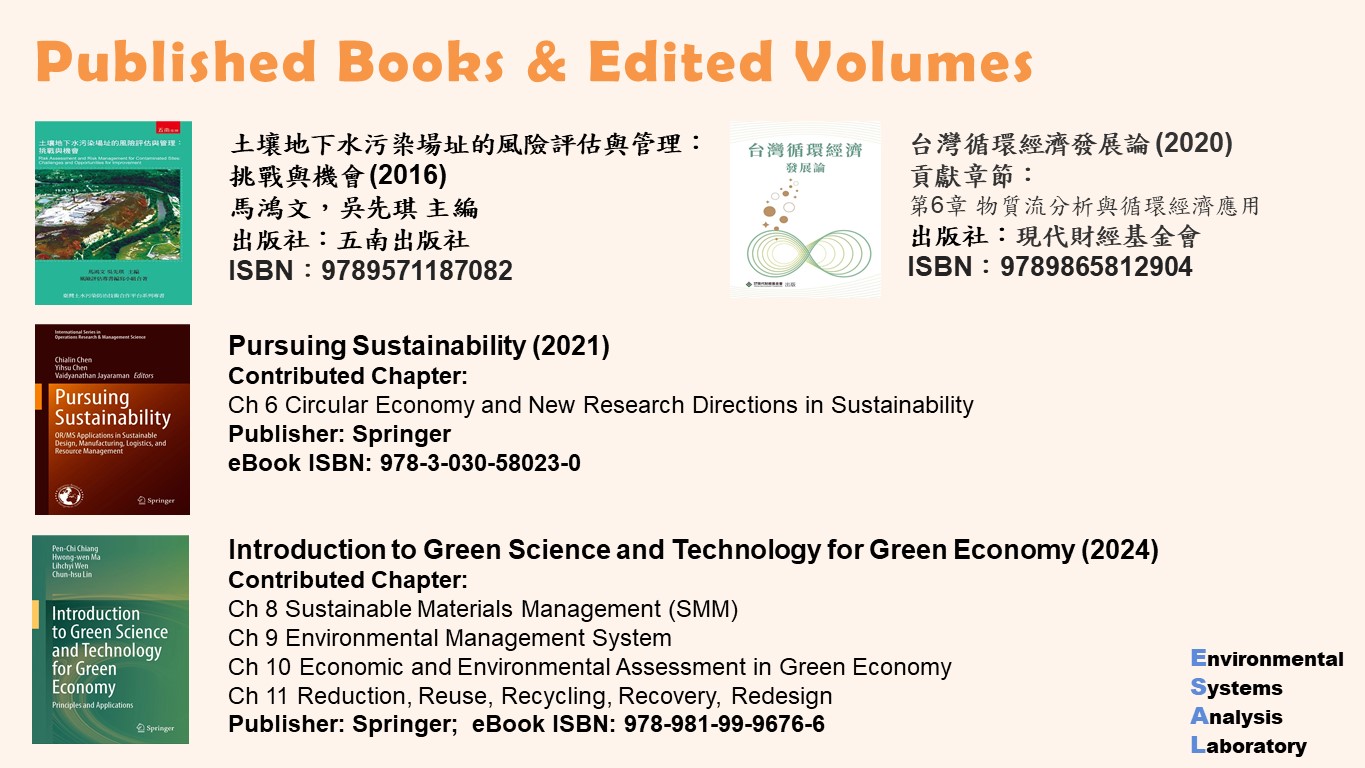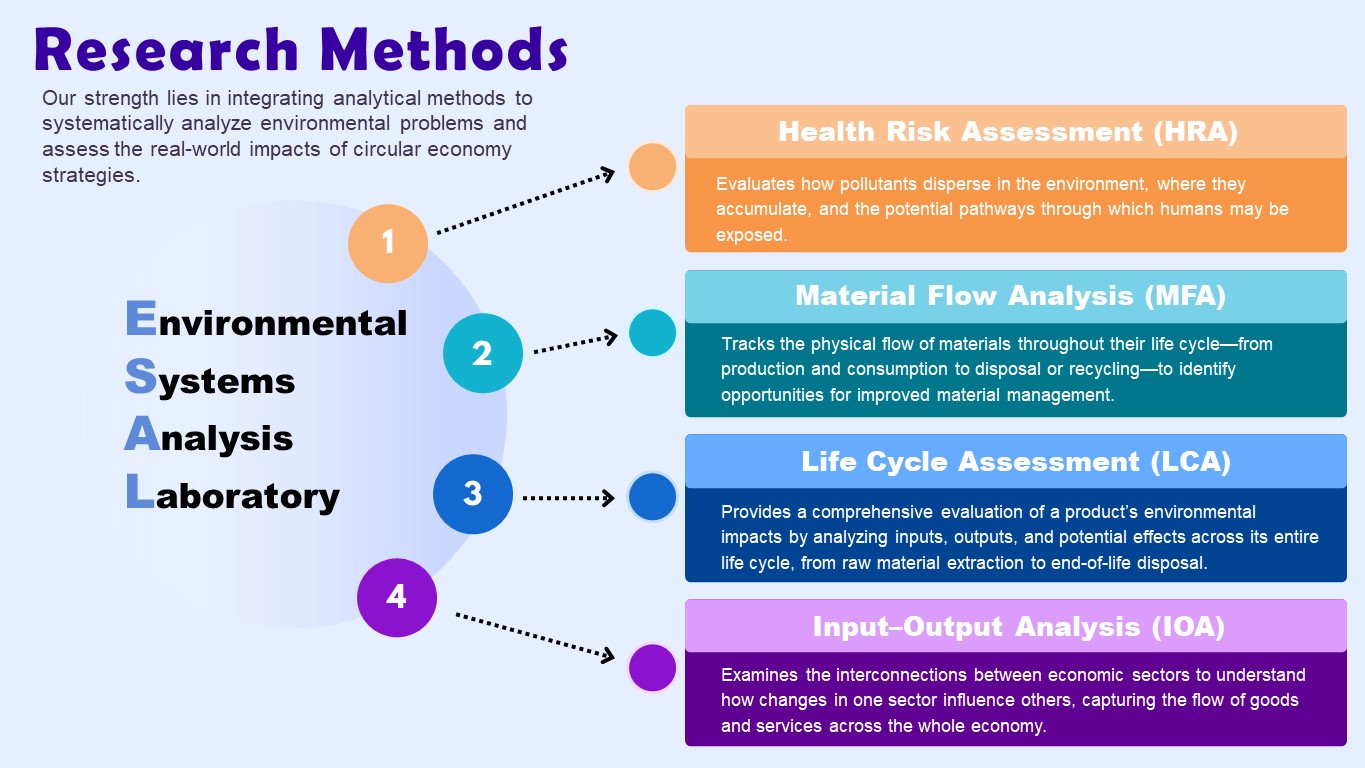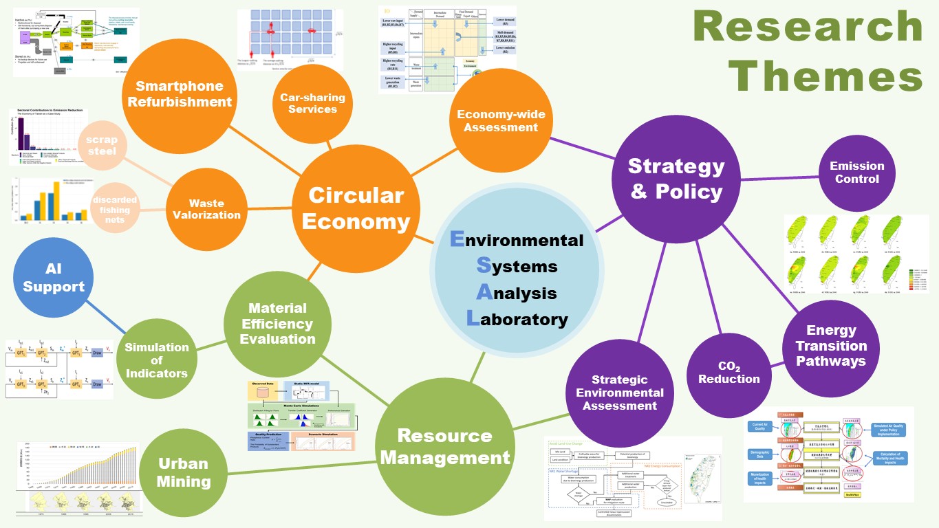 Our laboratory focuses on sustainable material management and the circular economy, developing quantitative methods to trace and evaluate material flows, distributions, driving forces and resulting environmental and economic impacts throughout the life cycle. This work reveals waste sources, treatment processes, and consumption patterns while designing practical circular strategies. We assess the supply chain distribution, the associated competitivity, and reduction potential of secondary materials across diverse circular pathways to reduce dependency on primary resources, thereby promoting the decoupling of resource use from economic growth. We also develop multi-regional integrated economic-environmental models, applied to green economy planning, deep decarbonization pathways, and forward-looking sustainable transition research in Taiwan, collaborating with international institutions to provide quantitative support for policy design. At the urban scale, we estimate urban resource stocks and waste-to-resource potentials, analyzing strategies for urban mining, resource circulation, and governance. Through cross-scale and interdisciplinary research, our laboratory is committed to assisting society in achieving sustainable transformation and advancing long-term goals of resource efficiency and environmental sustainability.