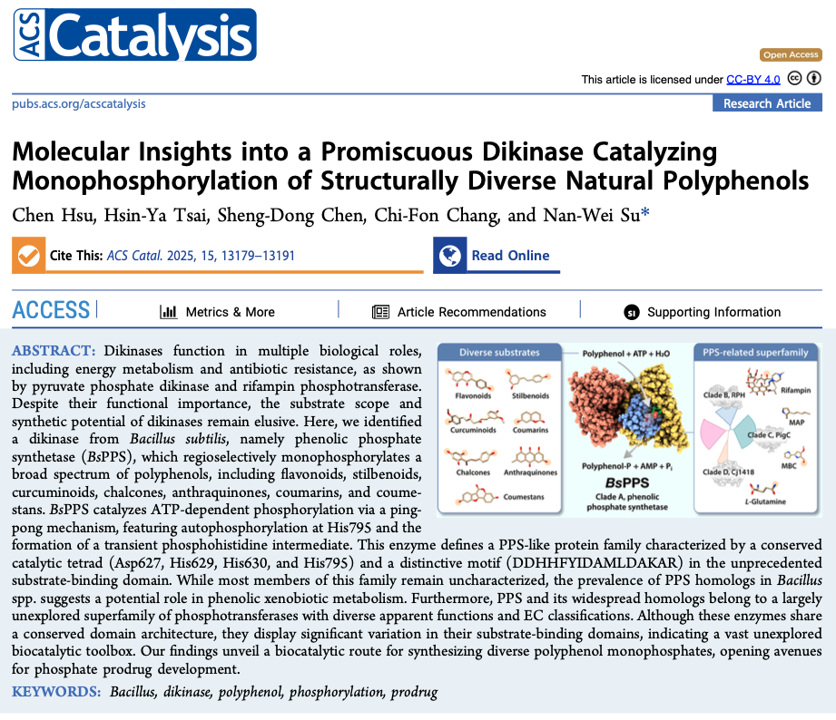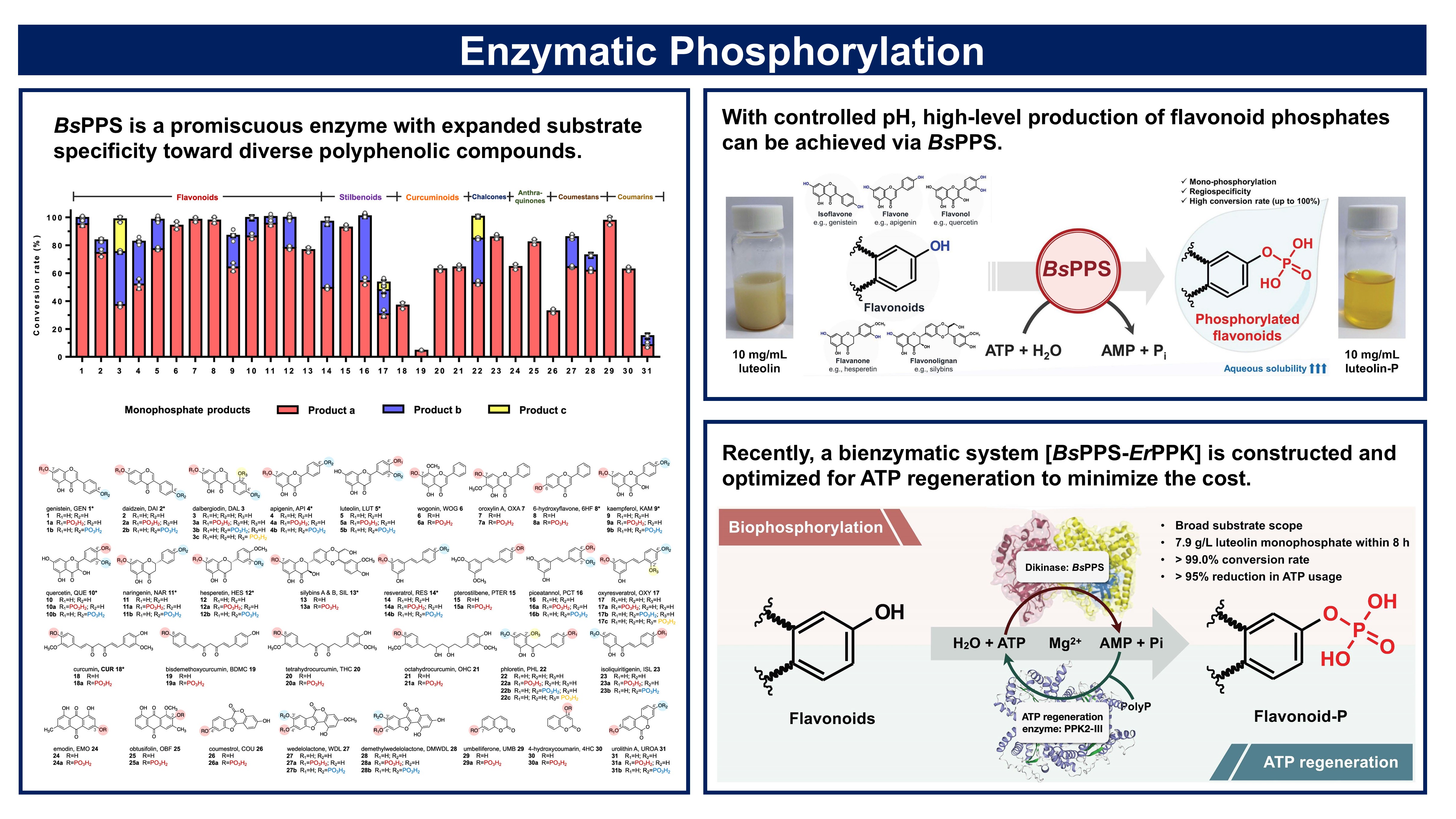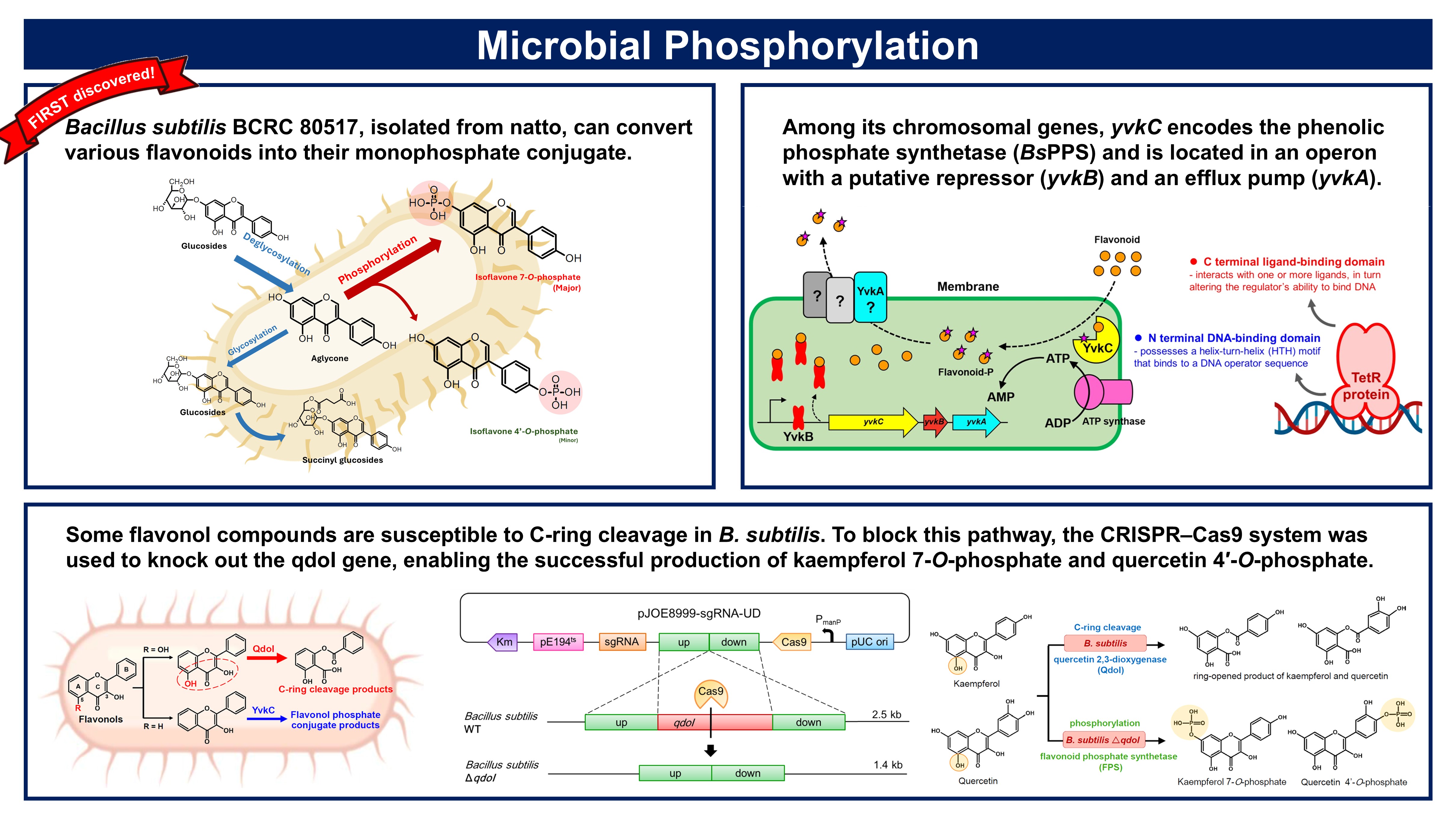Our laboratory focuses on the phosphorylation-based modification of natural polyphenolic phytochemicals, aiming to enhance their water solubility and bioavailability and overcome limitations in oral absorption and functionality. We pioneered the use of Bacillus subtilis as a microbial platform for the direct phosphorylation of polyphenols and identified a novel endogenous dikinase as the key enzyme, which further enabled the development of an in vitro enzymatic phosphorylation system.